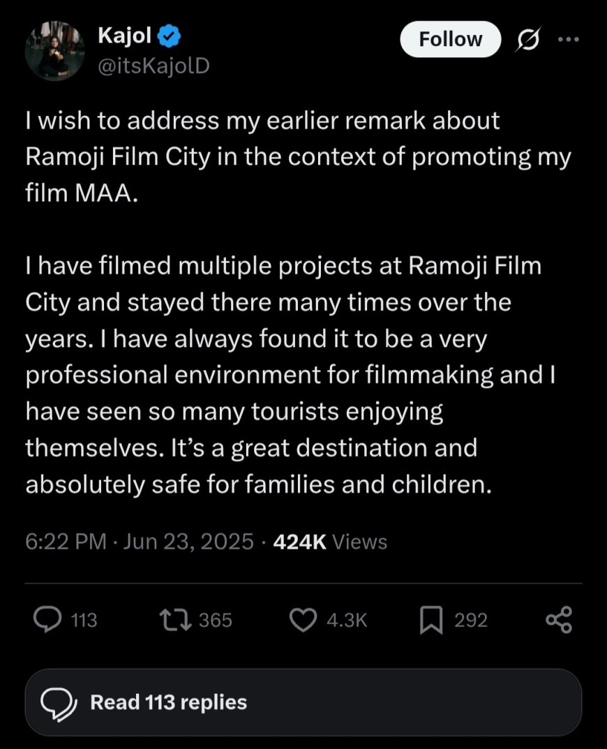 Responding to the wave of criticism, Kajol issued a clarification on her official X (formerly Twitter) handle. In her statement, she sought to clear the air, expressing her deep respect for the film city and its reputation. She wrote, "I wish to address my earlier remark about Ramoji Film City in the context of promoting my film MAA. I have filmed multiple projects at Ramoji Film City and stayed there many times over the years. I have always found it to be a very professional environment for filmmaking and I have seen so many tourists enjoying themselves. It's a great destination and absolutely safe for families and children."