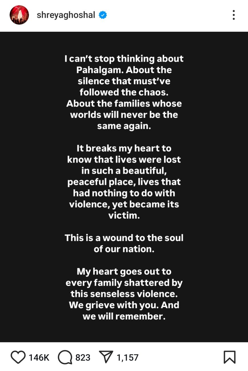 Following the attack in Pahalgam, Ghoshal had earlier expressed her grief through an emotional post on Instagram. She wrote, "I can't stop thinking about Pahalgam. About the silence that must've followed the chaos. About the families whose worlds will never be the same again. It breaks my heart to know that lives were lost in such a beautiful, peaceful place, lives that had nothing to do with violence, yet became its victim. This is a wound to the soul of our nation. My heart goes out to every family shattered by this senseless violence. We grieve with you. And we will remember." She captioned the post with a heartbreak emoji and the hashtag "#PahalgamAttack."